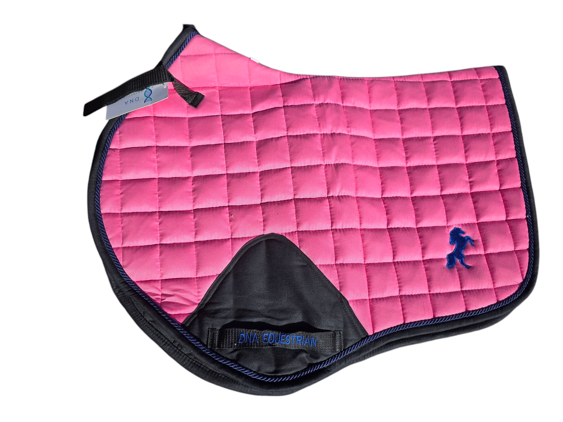 Pink saddle pad with blue horse embroidered on both sides. We also have a matching hoodie in stock.